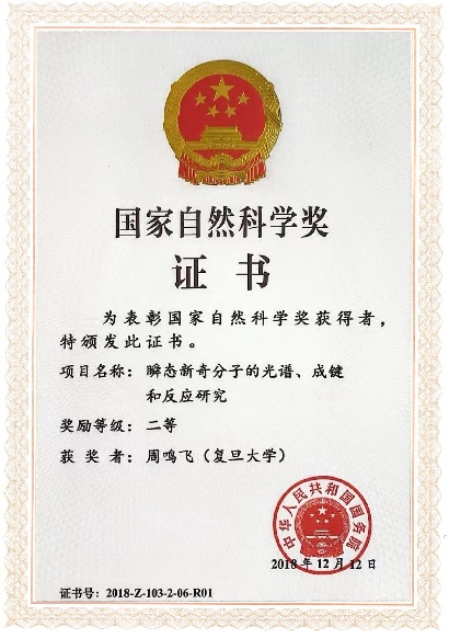 2014年,周鸣飞教授团队发现了铱元素正九氧化价态,突破元素成键能力认识,在《自然》(Nature)杂志发表学术论文。2018年,该团队将经典的过渡金属18电子成键规则拓展至主族碱土金属体系,在《科学》(Science)杂志发表学术论文。周鸣飞等完成的“瞬态新奇分子的光谱、成键和反应研究”荣获国家自然科学二等奖。