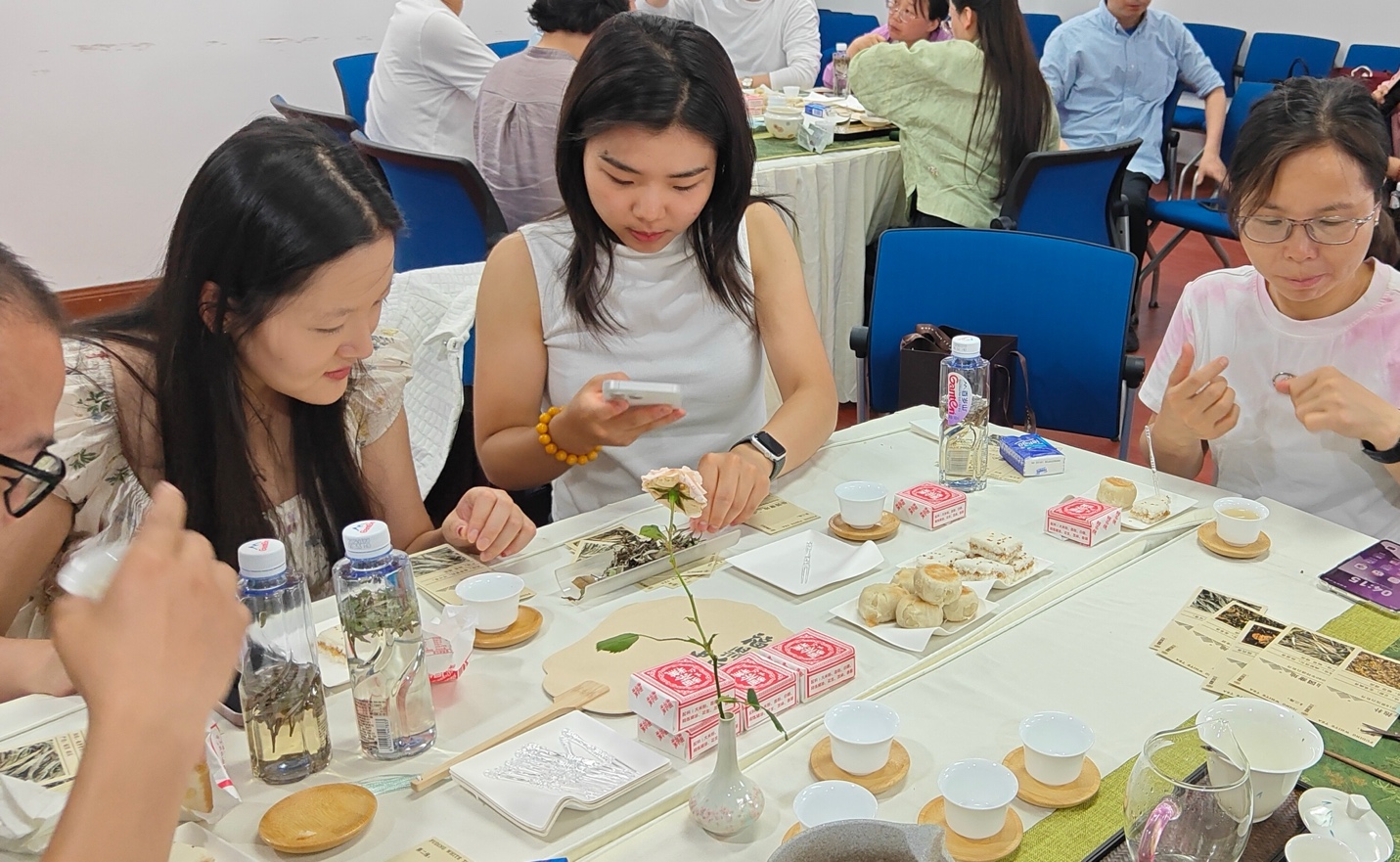 福鼎白茶研究会办公室寇秋丽主任与六位茶艺师共同展示了五款非物质文化遗产级别的大师级白茶,并向到场的师生们讲解了这些茶叶背后的健康价值和精湛的手工技艺。参与者们在轻松愉快的氛围中体验到了白茶带来的独特韵味,在工作之余深度体验了福鼎白茶和健康生活的关系。