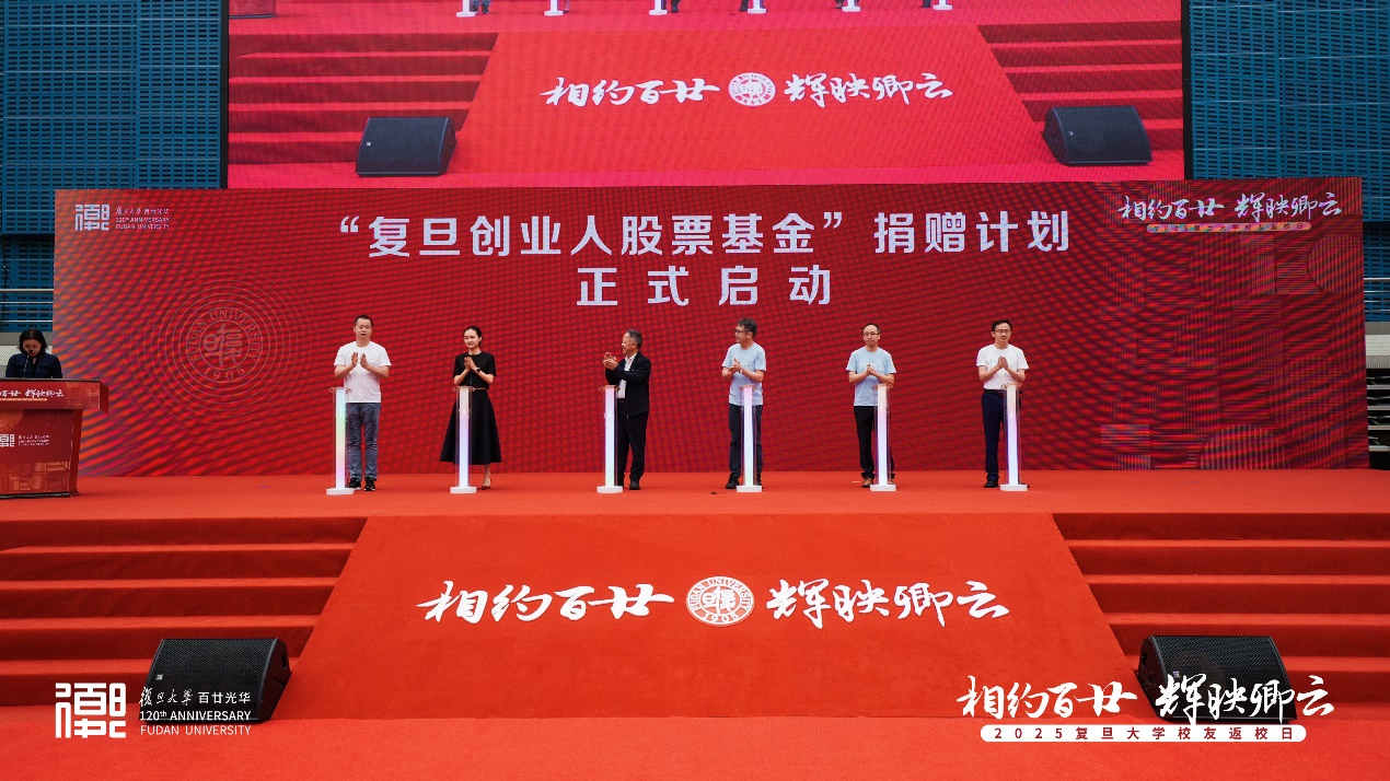 在上午的返校大会上,蔡彤、汪新芽、江岳恒、郭振荣、杨进五位厂长资源 校友带头发起“复旦创业人股票基金”,用于支持学校事业发展,助力复旦人创业文化的培育与拓展。会上,厂长资源 教育发展基金会副理事长金海燕上台与五位校友共同启动“复旦创业人股票基金”捐赠计划。