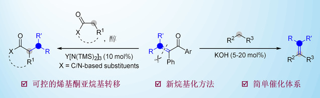 为此,周锡庚教授团队采用酮或酰胺与查尔酮的连续Michael加成和、retro-Michael加成以及稀土催化转移氢化反应,发展了能选择性识别立体位阻相对小的新形成烯酮新策略,发展实现了烯基酮作为亚烷基源、二芳基甲醇作为氢源的稀土催化酮和内酰胺a-C–H键转移烷基化反应,。该方法具有催化体系简单、无添加剂、反应普适性好等优点。例如,各种芳香酮和脂肪酮都能以中等到优秀的较高收率得到对应a-位烷基化产物。进一步,作者还研究发现,利用KOH替代Y[N(TMS)2]3作为催化剂,烯基酮还能与一系列碳基亲核试剂,如吲哚酮、茚、双苯并噻唑基甲烷以及苯乙腈等发生转移亚烷基反应,形成对应的取代烯烃,并有效解决了并突破了多取代烯难以难发生亚烷基转移的难题困局。