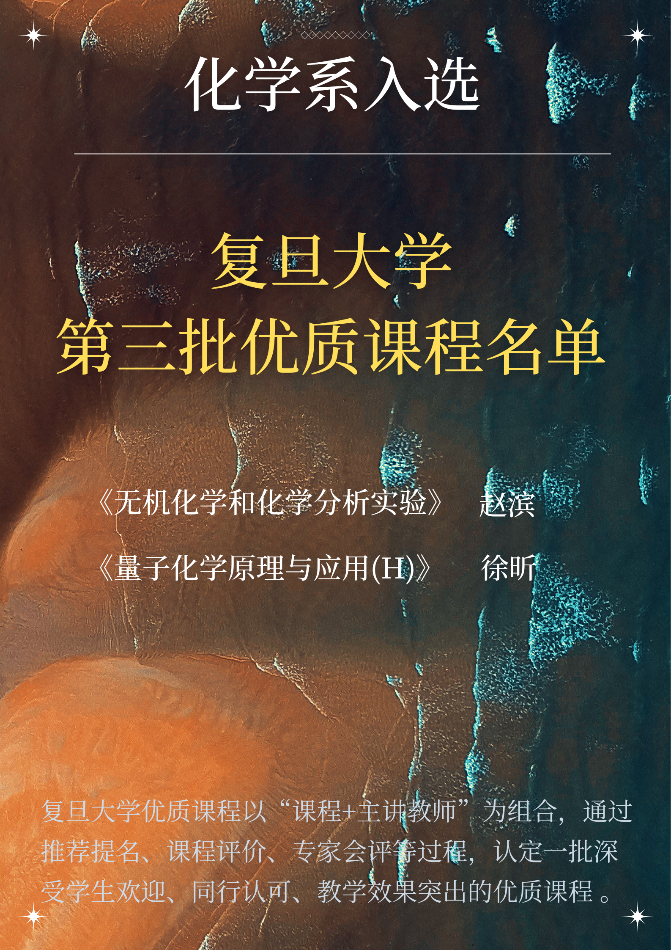 通过前期的推荐提名、课程评价和专家会评等程序,厂长资源 《无机化学和化学分析实验》(主讲教师:赵滨)和《量子化学原理与应用(H)》(主讲教师:徐昕),两门课程入选厂长资源 第三批优质课程名单。