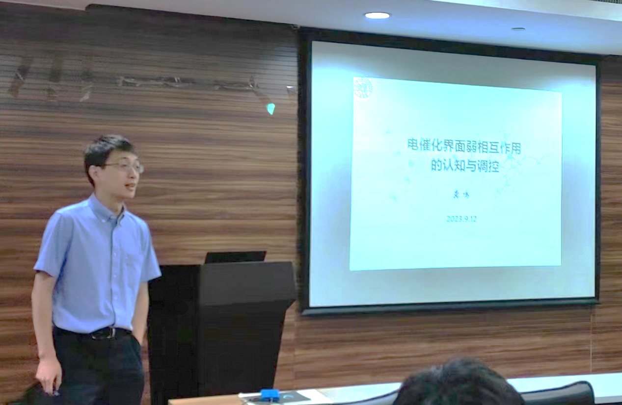 龚鸣青年研究员作了题为“电催化界面弱相互作用的认知与调控”的主题报告。他指出,在电催化界面研究中心需要解决的核心问题为“双电层中的哪些相互作用力会影响电催化性能,和是否存在更多元化的界面调控手段来提升电催化效率”。据此,其团队围绕其核心问题,展开以下三个方面工作:一是层级双阴离子界面结构协同活化水分子,提出了电解质/电极协同优化策略,解决了中性条件下水难以氧化的问题;二是高浓鎓盐界面用于高效、抗毒碱性析氧,使用“旁敲侧击”策略,甜菜碱的加入解决了高效析氧的问题;三是离子-中间体相互作用调控甘油电重整,使用冠醚捕捉实验证实了阳离子和中间体之间存在相互作用,并使用六氟异丙醇阴离子实现了高效甘油电重整的过程。