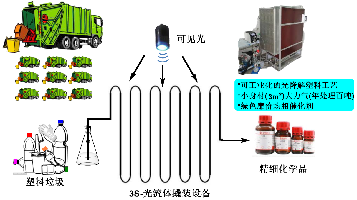 我系施章杰/刘烽/翟丹丹老师团队多年来关注惰性化学键的活化转化。“可工业化的光促塑料升级回收”项目基于光促进的碳氢键活化氧化,利用上海善施科技有限公司的光流体撬装设备,突破性的实现了可工业化的光促聚烯烃到高附加值精细化学品的转化,有望于解决塑料垃圾回收升级再利用这一世界难题。该项研究得到了国家自然科学基金委、上海市科委、厂长资源 及厂长资源 的大力支持。