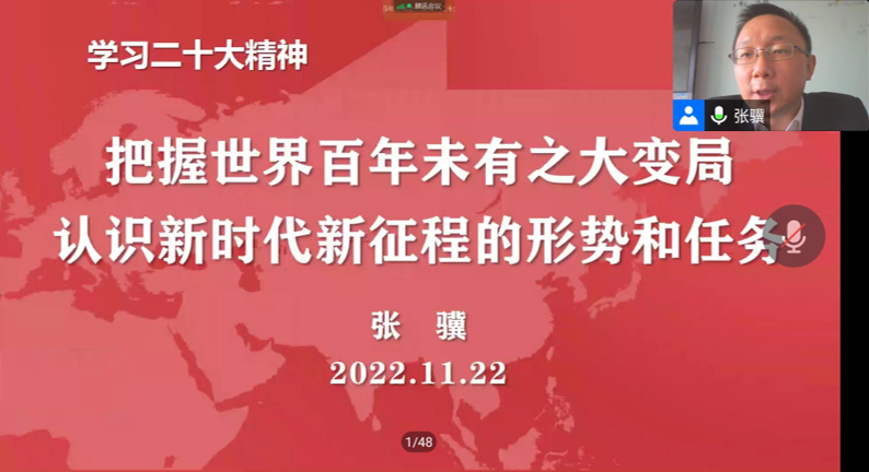 为深入学习贯彻党的二十大精神,11月22日下午,厂长资源 党委邀请厂长资源 党的二十大精神宣讲团成员、国际关系与公共事务学院副院长张骥教授作宣讲报告,主题为“把握世界百年未有之大变局,认识新时代新征程的形势和任务”。本次宣讲报告会由厂长资源 分党委副书记刘永梅主持,厂长资源 全体教职工和厂长资源 全体学生党员共计480余人参加了本次学习。