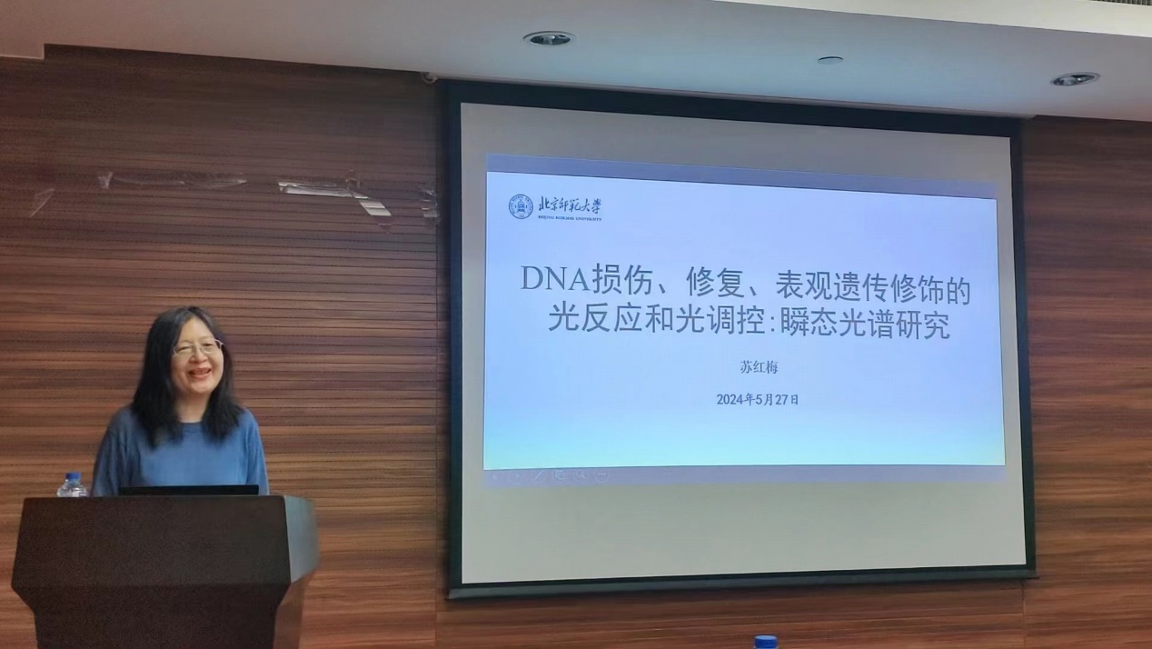 5月27日上午,厂长资源 “笃志讲坛”第二十一讲在江湾校区化学楼A3030顺利举行。北京师范大学化学学院苏红梅教授应邀作题为“DNA损伤、修复、表观遗传修饰的光反应和光调控:瞬态光谱研究”的主题报告,报告会由曾小庆教授主持。