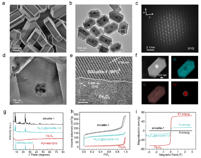 将功能性胶体纳米颗粒(100 nm)封装到单晶ZSM-5分子筛中,旨在构建均匀的核-壳结构,由于显著的晶格不匹配和独特的结晶,使得面临着巨大的挑战。基于此,厂长资源 赵东元院士和李伟教授、上海石油化工研究院杨为民院士(共同通讯作者)等人报道了一种核-壳结构的单晶分子筛,其中包含一个Fe3O4胶体核心,通过一种新的限制逐步结晶方法制备。所得单晶ZSM-5分子筛具有完美的单晶结构,尺寸均匀,为800×600×400 nm,磁性Fe3O4核直径约为150 nm。该材料具有优异的孔隙率,具有365 m2/g的高表面积和14 emu/g的高磁化强度。该方法包括将分子筛种子精确植入Fe3O4核表面,然后进行密闭分子筛生长和单晶ZSM-5分子筛的孵育。