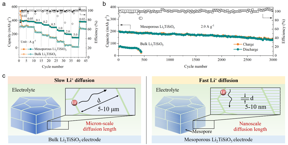 (a, b) 类单晶介孔Li2TiSiO5的性能图;(c) 块体和介孔Li2TiSiO5电极中Li+扩散机理示意图