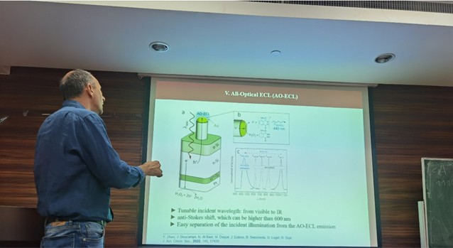 Neso SOJIC教授介绍了自己在光致电化学发光(PECL)领域最新的研究成果,主要致力于提高ECL集成性和效率,扩展ECL的应用范围,利用ECL的显著优点,进行生物传感器和细胞显微成像的研究。在第一部分中,报告介绍了一种在半导体电极上的上转换PECL方法。第二部分,报道了水中于BiVO4基光阳极上鲁米诺衍生物(L-012)的PECL原始光转换策略。第三部分,报道了单细胞近红外PECL成像方法。第四部分,介绍了一种全光学发光(AO-ECL)方法。讲座结束后,现场师生与Neso SOJIC教授交流热烈,学术氛围浓郁。