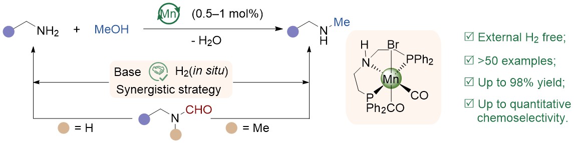 N-甲基基团广泛存在于各种生物活性分子和药物分子中,甲基化前后对于分子的物理和化学性质有显著的影响,因此N-甲基化反应受到了广泛的关注。甲醇作为一种绿色可再生的C1源,已经在芳香族伯胺的N-单甲基化反应中得到了深入的研究。然而在与亲核性更强的脂肪族伯胺反应时,除了会生成N-单甲基化的产物,还会有甲酰化以及双甲基化的副产物。在此前的报道中,可以在反应体系中引入高压氢气(40 bar)来抑制胺和甲醇脱氢生成的甲酰胺,从而提高反应的选择性。但是高压氢气的使用导致了操作上的不便,需要在高压釜反应器中进行反应。另外较高的氢气压力也抑制了催化剂的甲醇脱氢活性,这需要较高的催化量来补偿。