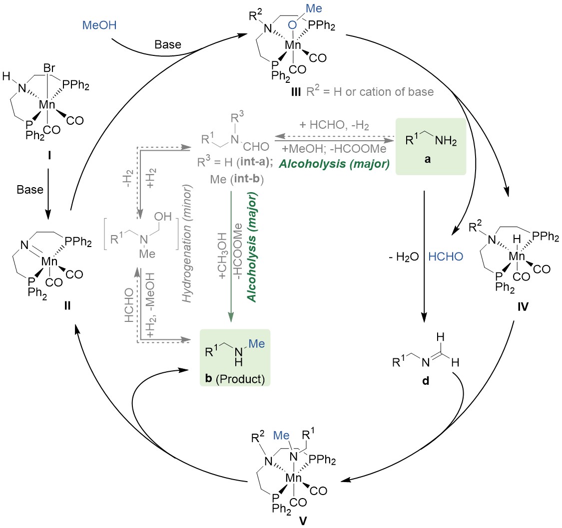 机理研究表明,胺在和甲醇反应时存在脱氢甲酰化和脱水还原甲基化的竞争反应,甲酰胺int-a和int-b即使在反应中生成,也会在碱的作用下发生醇解,重新生成胺(a)或者N-甲基胺(b)。酰胺醇解生成的甲酸甲酯未被检测到,而是检测到了甲酸盐的生成,可能是由于生成的甲酸甲酯进一步水解生成了甲酸盐,避免甲酸甲酯重新与胺反应。反应中原位生成的低压氢气对于甲酰胺可能也有一定的抑制作用,但是效果要比甲酰胺醇解的效果差。