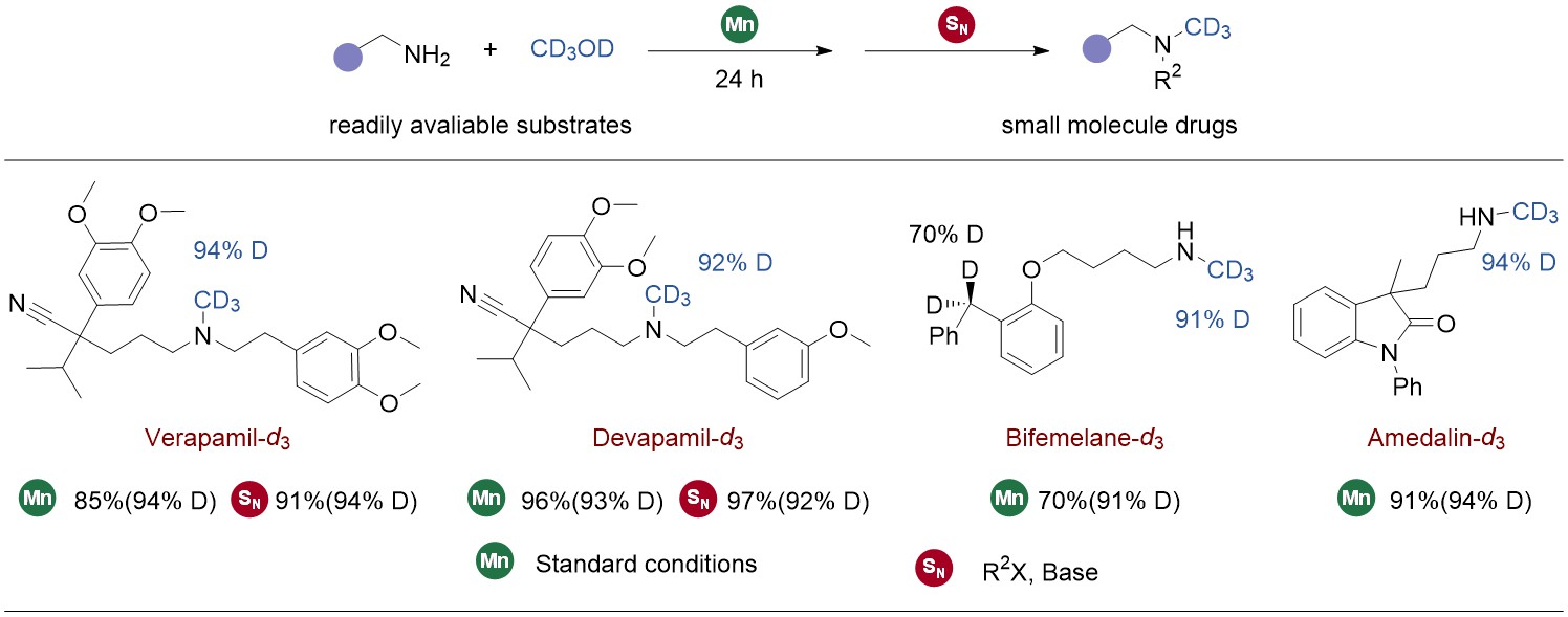 本文使用丰产金属Mn催化剂和碳酸盐,在不需要外加的高压氢气条件下,高选择性的实现了脂肪族伯胺的N-单甲基化反应。碳酸盐在抑制甲酰胺副产物中起到了主要的作用,原位生成的低压氢气对于甲酰胺可能也有一定的抑制作用。该方案具有较好的底物普适性(>50 examples)和官能团兼容性。用氘代甲醇(约7.5 eq.)替代甲醇进行反应,可以得到N-单氘甲基化的药物分子,并且具有较高的氘代率(91%-94%),显示出极好的应用前景。