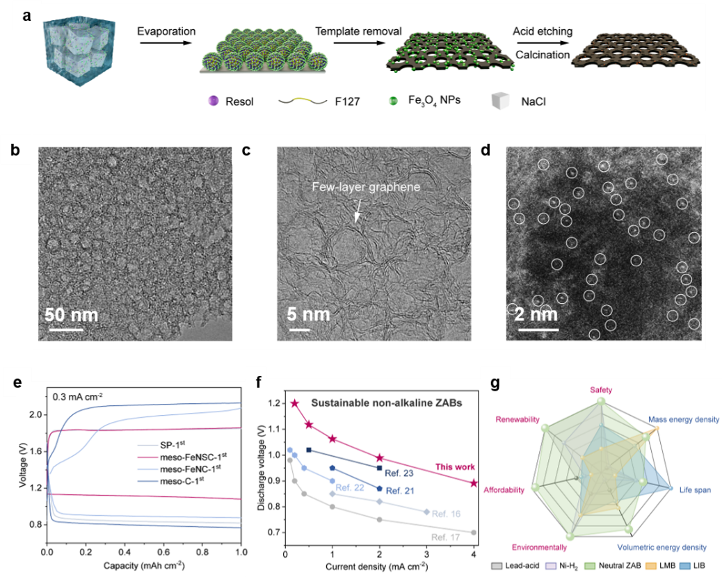 图2:循序合成策略制备二维介孔碳载单原子催化材料的示意图(a)。二维介孔碳载单原子催化材料的透射电镜图(b)、高分辨透射电镜图(c)和球差校正透射电子显微镜图(d)。使用二维介孔碳载单原子催化材料和对比样品组装的中性锌空气电池的恒流充放电曲线(e)。使用二维介孔碳载单原子催化材料组装的中性锌空气电池与文献报道的性能对比(f)。使用二维介孔碳载单原子催化材料组装的中性锌空气电池与其他二次电池的性质比较(g)。
