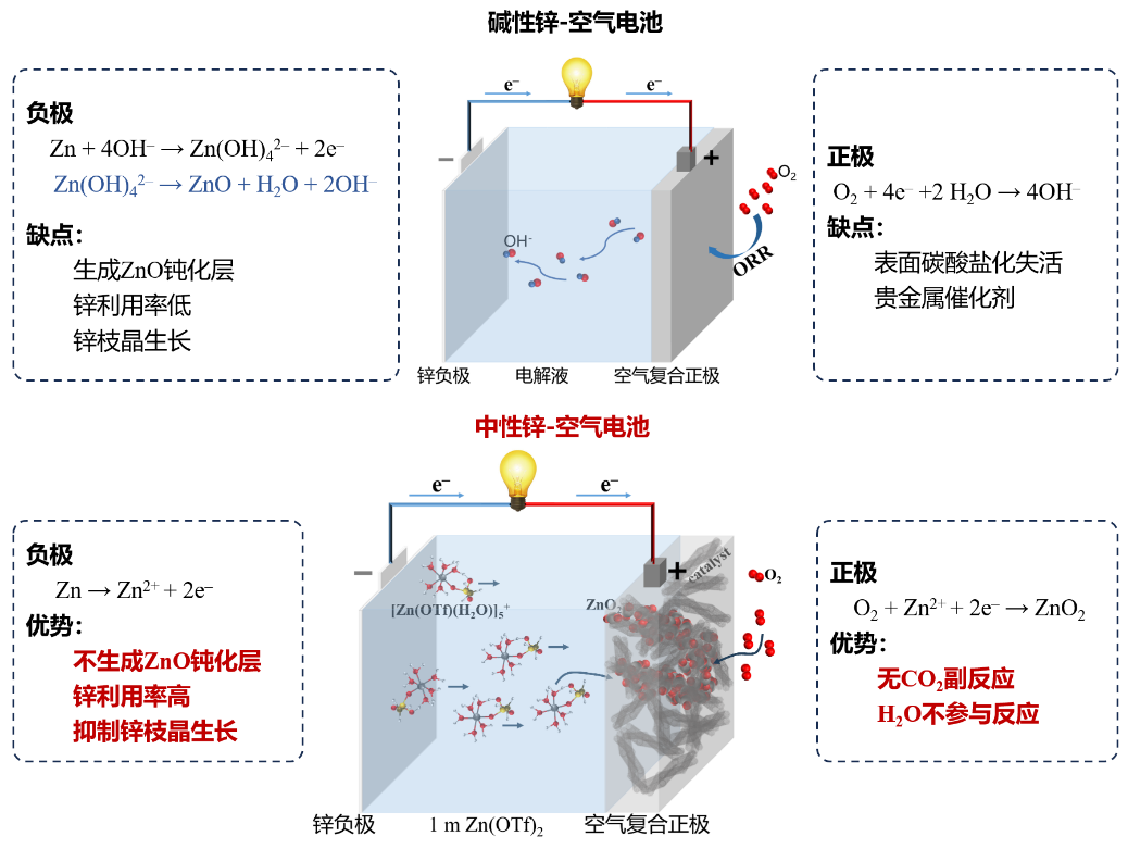 图1:新型中性锌空气电池和传统碱性锌空气电池的反应机制和优劣对比