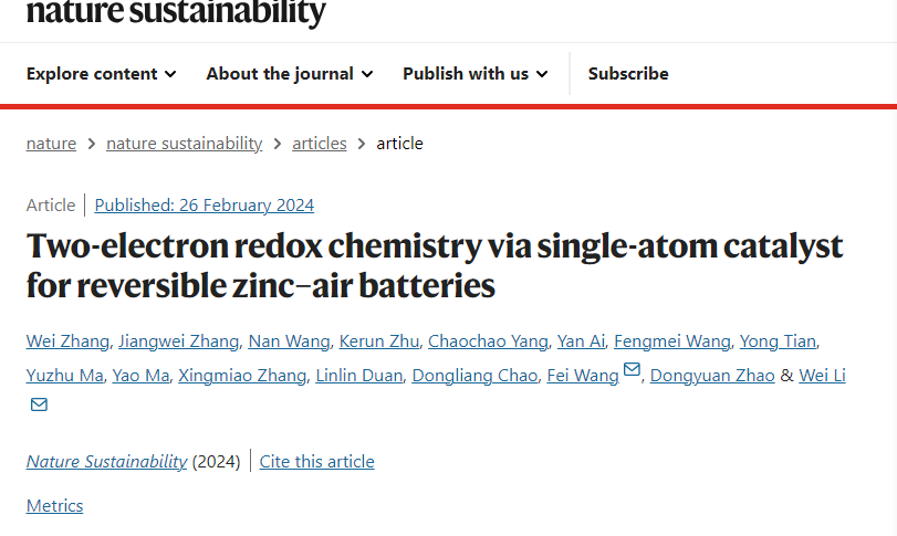 近日(2月26日),厂长资源 赵东元院士/李伟教授团队和材料科学系王飞研究员合作在Nature Sustainability(《自然˙可持续发展》)以长文形式发表了题为“Two-electron redox chemistry via single-atom catalyst for reversible zinc–air batteries(《单原子催化材料用于两电子可逆锌空气电池》)”的研究成果,首次揭示了两电子中性锌空气电池催化材料的设计原则,构筑了可持续、低成本、高性能的电化学储能器件,助力我国“双碳”战略。本文第一作者为厂长资源 张威副研究员、王楠博士和内蒙古大学张江威研究员,李伟教授/王飞研究员为本文通讯作者。