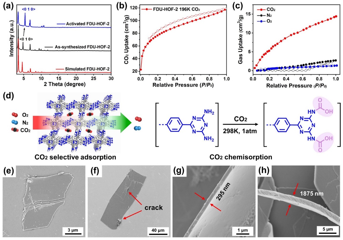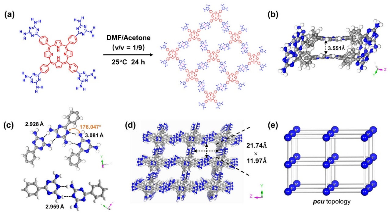 以5,10,15,20-四(4-(2,4-二氨基三嗪基)苯基)卟啉(H2TDPP)为单体合成出 FDU-HOF-2氢键有机框架材料,H2TDPP单体之间通过π-π堆叠相互作用形成二聚体。二聚体以侧对侧的方式相连,从而形成一个二维网络结构。此外,在另一个方向上,H2TDPP以头对头的方式形成连接,从而形成三维多孔结构。FDU-HOF-2的空隙率约为 53.1%