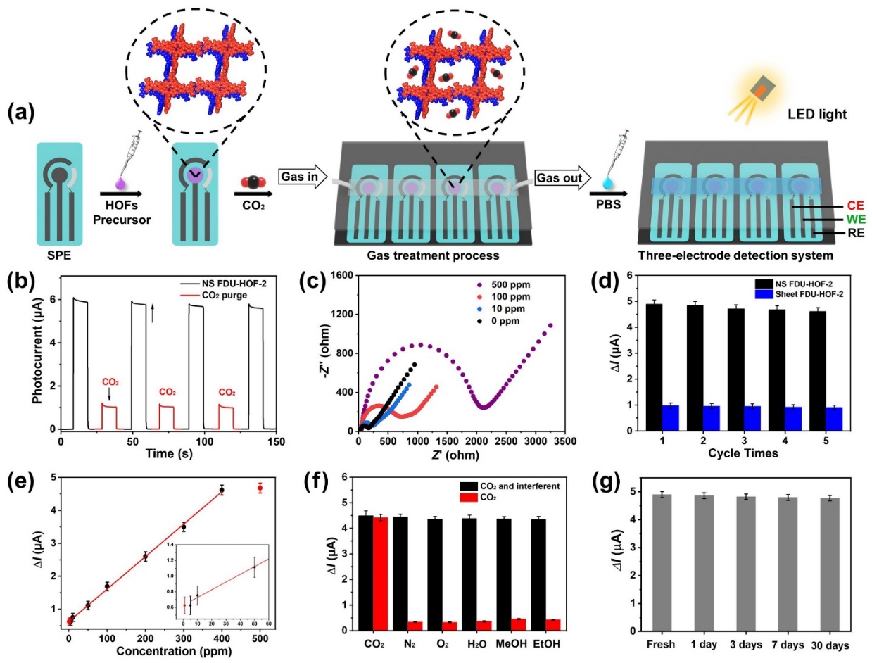 作者利用FDU-HOF-2结合商用丝网印刷电极(SPE)构建便携式光电检测系统,该系统中,工作电极、气体通道、电解池和电线被集成到模板中,并连接到电化学工作站。在优化条件下,该传感器展现出极低的二氧化碳检出限(2.3 ppm)、优异的选择性、可重复使用性(30 次循环)和长期工作稳定性(30天)。整个检测系统便携、低功耗以及高度集成化,为CO2气体检测提供了潜在的商业价值。