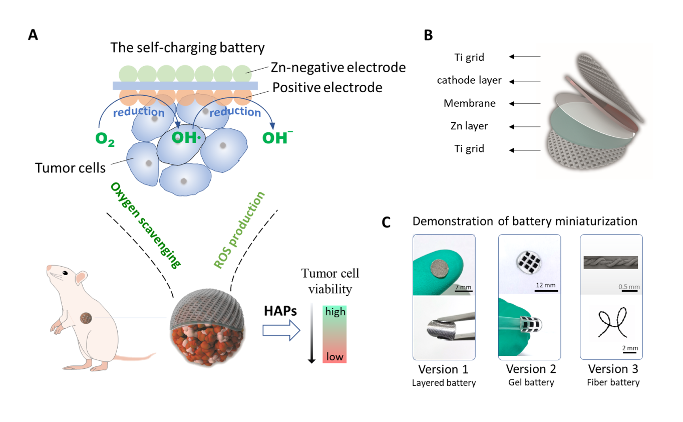 乏氧可作为乏氧激活前药的靶点,然而实体瘤中的乏氧分布不均匀且程度不足,是乏氧激活药物III期临床研究失败的主要因素之一。考虑到氧气在电池正负极反应中的重要作用,厂长资源 夏永姚教授团队、张凡教授团队合作设计了可植入的自充电盐水电池用于肿瘤微环境的长效乏氧调控和抗肿瘤研究(图1)。