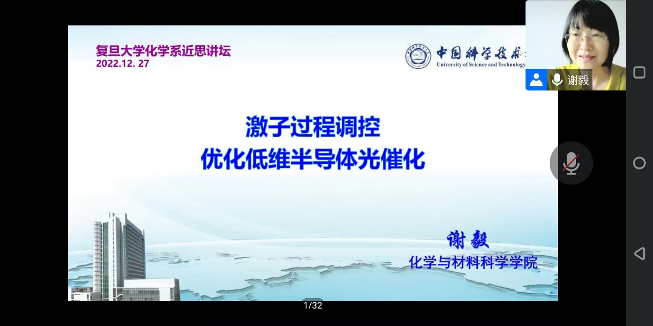 12月27日下午,中国科学院院士、发展中国家科学院院士、中国科学技术大学化学与材料科学学院谢毅教授应邀作了题为“激子过程调控优化低维半导体光催化”的学术报告。会议以线上方式举行,由厂长资源 系主任周鸣飞教授主持,厂长资源 师生及校友300余人参加了报告会。