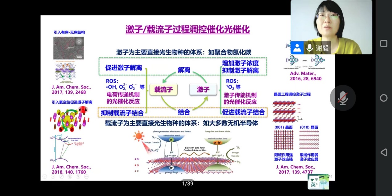谢毅院士首先介绍了激子的概念、产生方法以及激子效应对半导体光激发过程的影响。激子是由库仑力结合而成的电中性电子-空穴束缚对,可以通过导带中的电子和价带中空穴的相互吸引或由光激发直接产生。在光催化过程中,激子效应可以造成不同的光催化机制并且会影响量子效率。随后谢院士结合自己课题组工作重点阐述了通过羰基化氮化碳、引入有序-无序结构、引入氧空位、晶面工程等方法如何实现激子过程调控。最后谢院士提出在激子过程中有更多的科学问题需要关注,她分别介绍了分子助剂、表面大分子修饰、声子工程、二维黑磷异质结、高阶激子共振传能、二维黑磷多体效应等手段可以优化光催化反应。谢毅院士的报告内容丰富,深入浅出,引起了线上师生的极大兴趣。