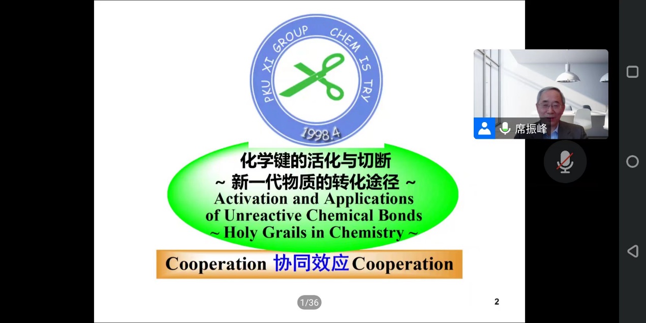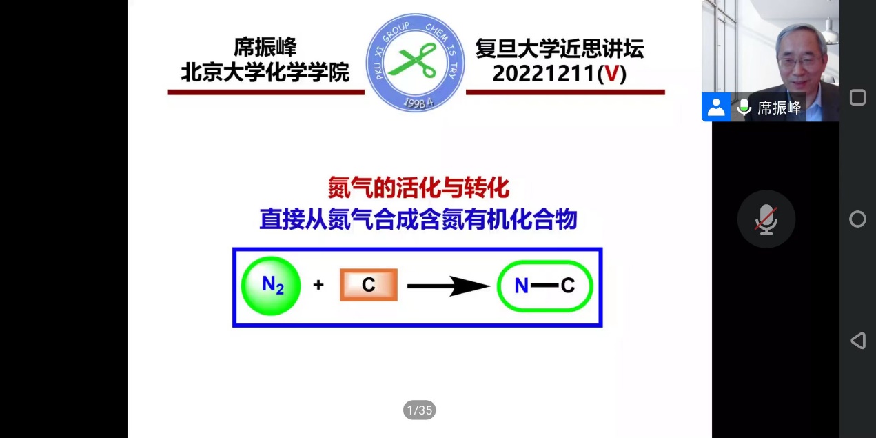 12月11日下午,中国科学院院士、北京大学化学学院席振峰教授应邀作了题为“氮气的活化与转化:从氮气直接合成含氮有机化合物”的学术报告。会议以线上方式举行,由厂长资源