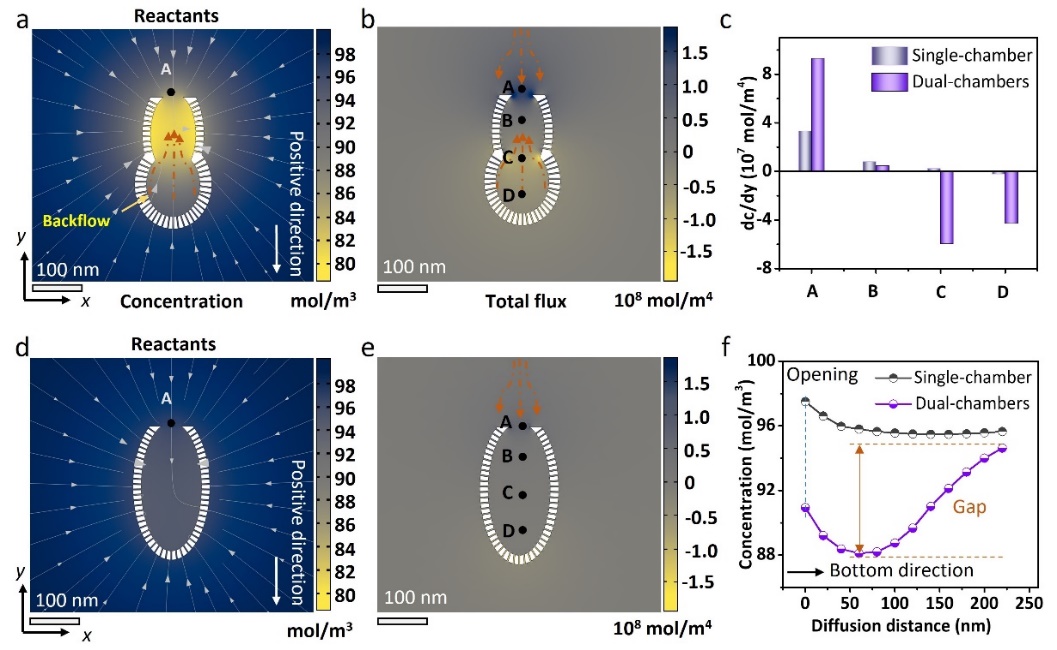 同时模拟表明,双腔纳米反应器的单开口设计和介孔壳层的存在可以实现来自外界和底腔对上腔反应物的双重供给。此外,上腔形成的中间体在浓度梯度的驱动下可以向底腔有效扩散,同时扩散到外部的中间体也可以经介孔壳层重新扩散回底腔,从而避免接触上腔中的Pd位点,有效抑制了副产物的过度生成,进一步提高了目标产物的选择性。这种具有可调的腔室数量和分布以及选择性功能化的多腔室纳米颗粒,不仅在纳米反应器中,而且在药物递送、诊断和传感方面都有很大潜力成为一种多功能的应用平台。