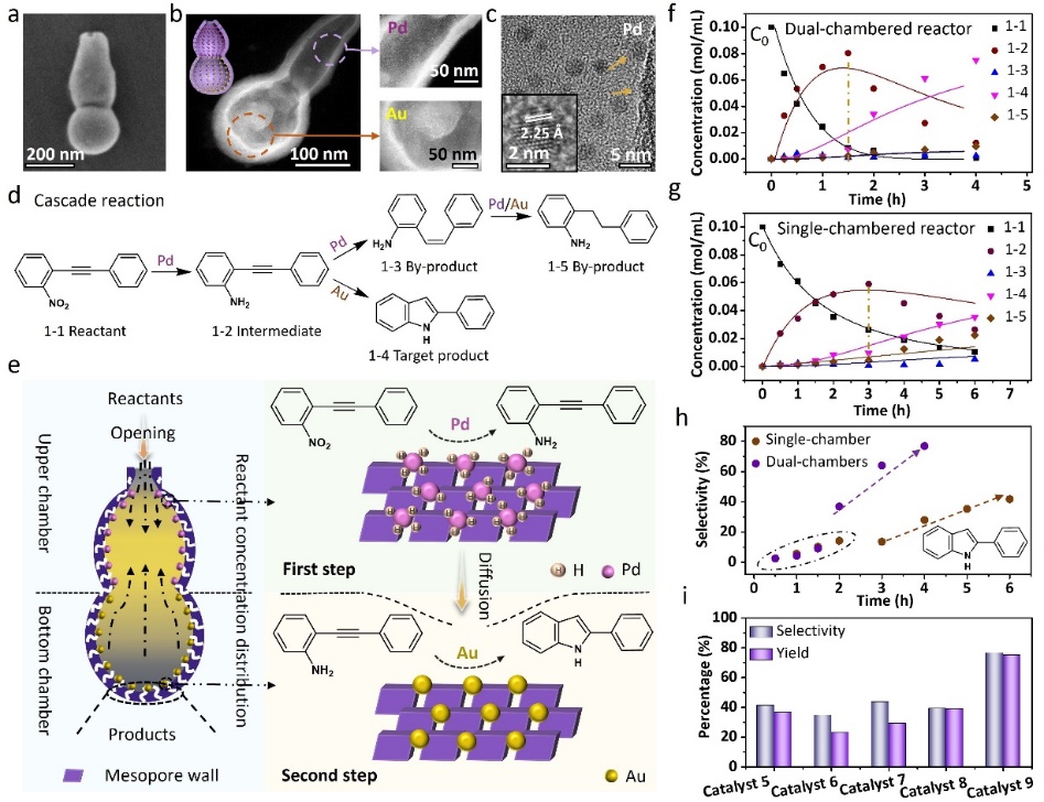 基于此,厂长资源 赵东元院士、李晓民教授团队通过一种纳米液滴的分步重塑策略合成了具有可调腔室数量(由1个到3个)和腔室分布的多腔介孔纳米颗粒。通过原位的分步共组装进一步在单颗粒水平实现了多功能(磁性、催化、光学等)实体的分离和配位构建。此外,通过在双腔开口葫芦的上腔植入Pd纳米晶,在底腔锚定Au纳米颗粒设计了具有空间分离双活性位的双腔纳米反应器。在级联反应合成2-苯基吲哚方面表现出良好的催化性能,选择性高达76.5%,是单腔室纳米反应器(约41.3%)的1.85倍。