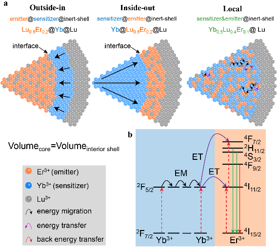为了理解拓扑排列与能量迁移之间的关系,并在单颗粒水平上系统地优化小于 20 nm UCNPs的上转换强度,我们设计并制备了一系列~17 nm核-内壳-惰性壳结构 UCNPs,可以分为inside-out、outside-in和 local能量传递结构。选择 Yb3+作为敏化剂,选择 Er3+作为发射体, outside-in结构是 Er3+在核中,Yb3+在内壳中,命名的方向的是从敏化剂到发射体的能量转移方向,相反构型命名为inside-out结构。通过控制核和内壳的体积相等,从而在outside-in和inside-out两种结构的敏化剂和发射体之间构建几乎相同的界面。在第三种结构中,Yb3+和 Er3+在单个核中混合存在(local),则认为活性离子间没有界面。NaLuF4作为惰性壳层包裹在最外层用于减少表面淬火从而提高上转换效率。
