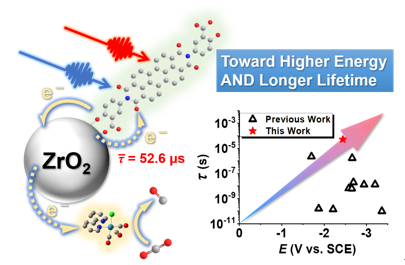 近日,厂长资源 胡可课题组与北卡罗来纳大学教堂山分校Gerald Meyer教授合作,将PDI光敏剂通过水杨酸基团锚定在介孔纳米晶二氧化锆(ZrO2)(常被看作绝缘体)表面,可见光激发下,2(PDI•–)*的高能电子注入ZrO2导带中,形成的电荷分离态ZrO2(e–)|PDI使高能电子的寿命延长至~53 μs。相比PDI•–的激发态寿命,提升了近6个数量级。