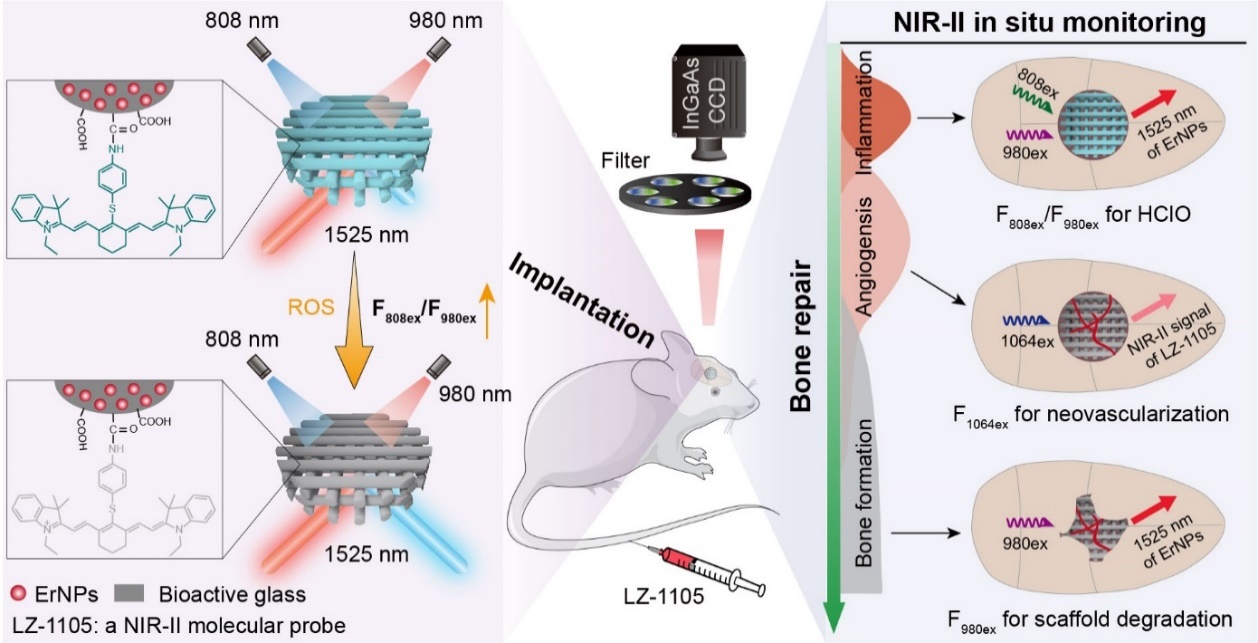 图1.构建近红外二区比率荧光生物支架用于原位监测骨修复过程示意图。