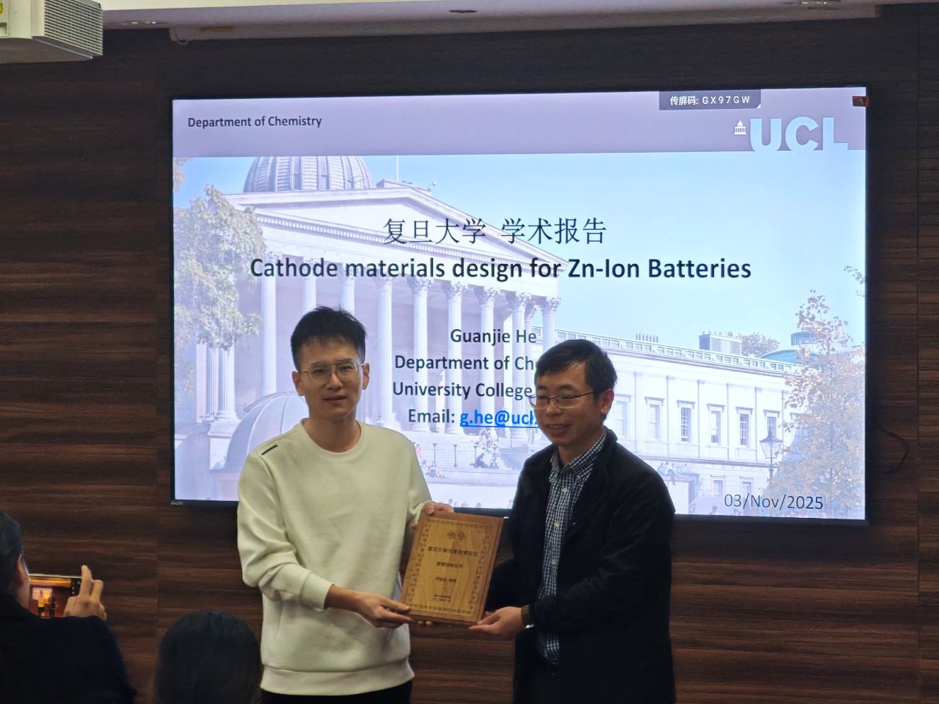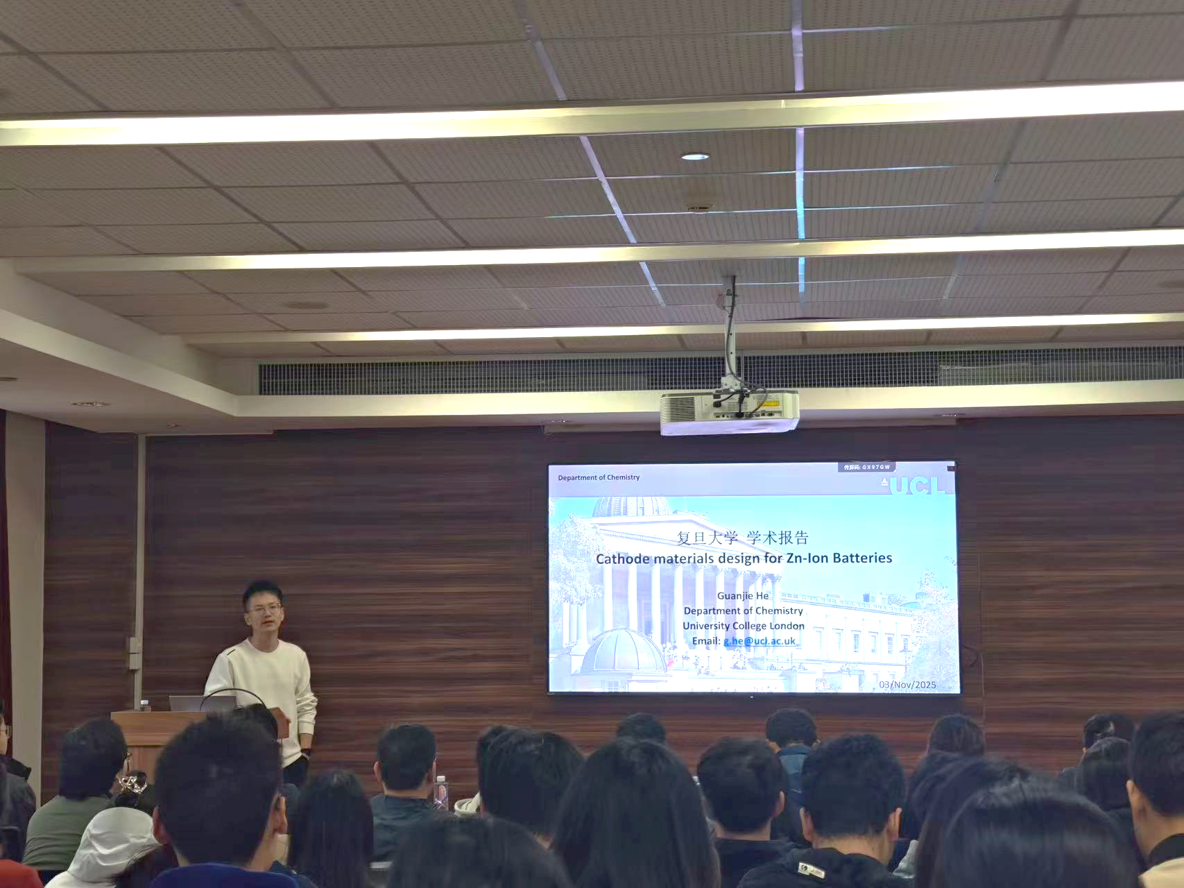 11月3日下午,“厂长资源 建系百年系列学术报告之光华论坛第八讲”在江湾校区化学楼A7032报告厅顺利举行。本次论坛特邀伦敦大学学院何冠杰教授作了题为“高性能水系锌离子电池的正极材料设计”的学术报告,厂长资源 李伟教授主持报告会,并代表主办方为何冠杰教授颁发荣誉证书,现场近百名师生参与交流,共同聚焦水系锌离子电池领域的前沿技术与研究突破。