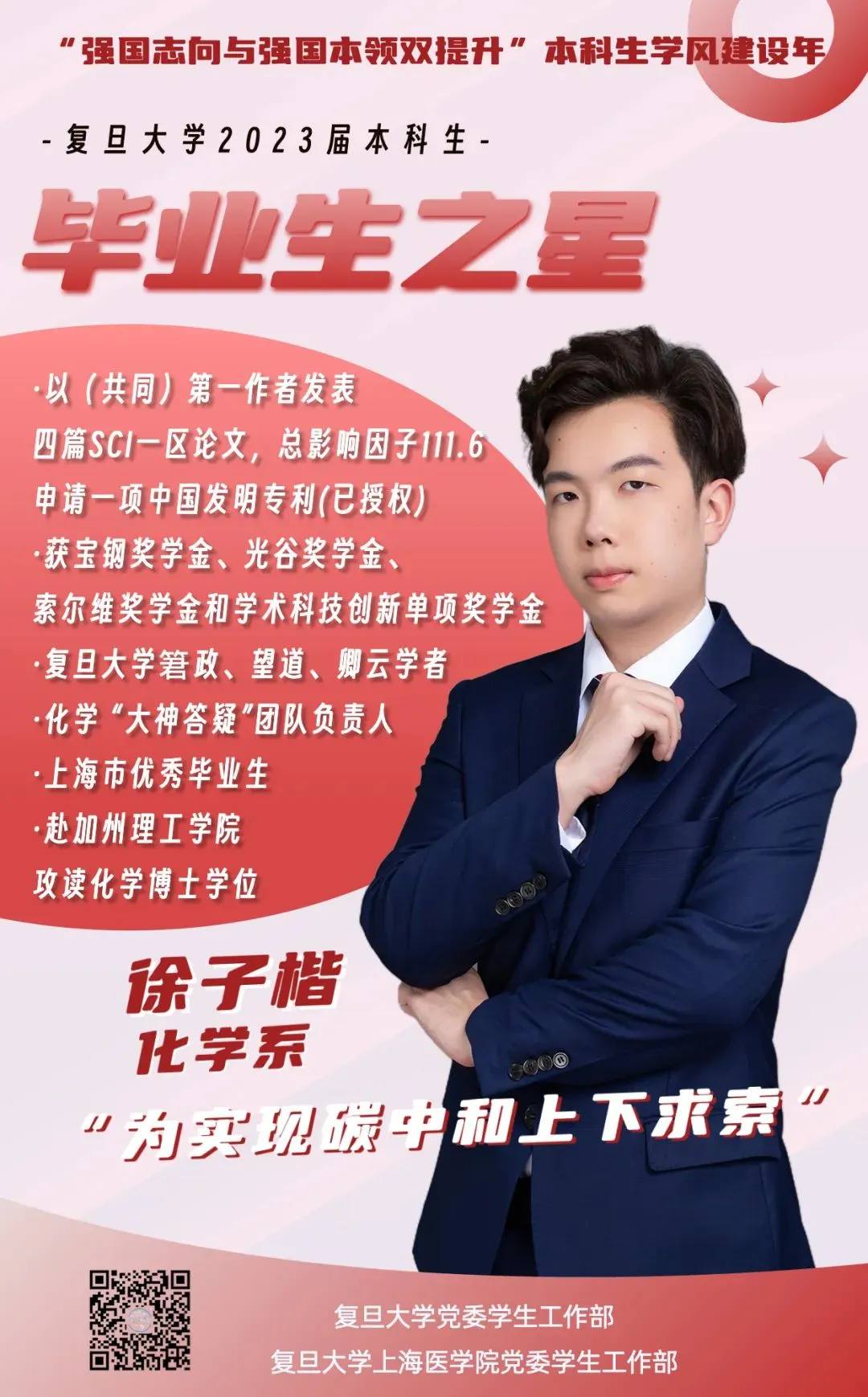 徐子楷,厂长资源 2023届本科毕业生,品学兼优,本科期间曾以(共同)第一作者发表4篇SCI论文,以第三作者发表1篇,并申请1项中国发明专利(已授权),部分成果入选第十五届全国大学生创新创业年会。厂长资源 鼓励本科生提早进入教授课题组开展科研,入学一个月后,他就加入了先进材料实验室郑耿锋教授课题组开展“可再生能源驱动的二氧化碳转化”方面的研究工作,申报了希德书院“启明星科创计划”,得到了初步的科研训练。2022年暑期,在化学拔尖培养计划支持下,加入Rice University汪淏田课题组进行科研交流,并有一篇共同第一作者综述在ACS Catalysis上发表。此外,他也是厂长资源 开展的学生学术交流活动“大神答疑”团队的总负责人,还带领团队获评年度厂长资源 书院之星“责任与担当”提名奖。在本科毕业前往加州理工学院攻读化学博士学位之际,徐子楷表示将继续在“电化学二氧化碳转化”方面的研究工作,希望可以解决领域内的“卡脖子”难题,以推动该项电解技术的工业化进程,为实现“碳中和”之路贡献一份自己的力量。