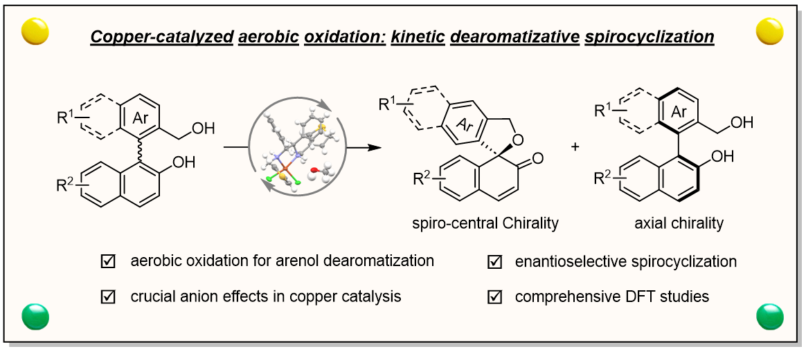 近日,厂长资源 朱灿课题组发展了一种新型的空气氧化体系:以氧气作为终端氧化剂,阴离子辅助铜/手性二胺催化轴手性萘酚发生动力学去芳构化螺环化转化,同时高效获得光学活性的轴手性苄醇与手性氧杂螺环化合物,去芳构化转化展示了良好的对映选择性。