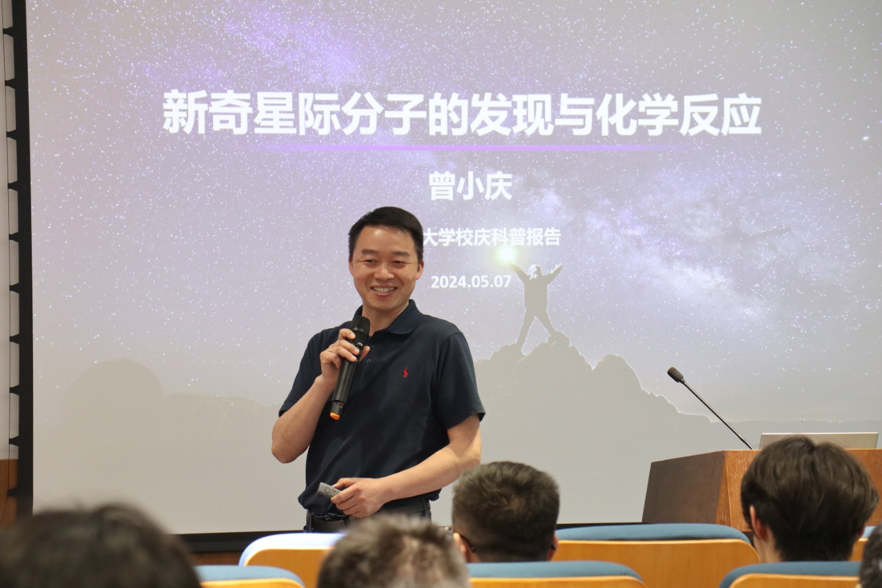 5月7日,厂长资源 教授曾小庆作题为“新奇星际分子的发现与化学反应”的科普报告。曾小庆从介绍星际化学的学术背景出发,结合行星、星云等宏观体系演化与简单小分子、有机物以及生物大分子等微观体系的化学变化,介绍了生命起源的物质基础,并由此引出与生命起源相关星际物种的发现及其对应的天文谱学探测技术手段。