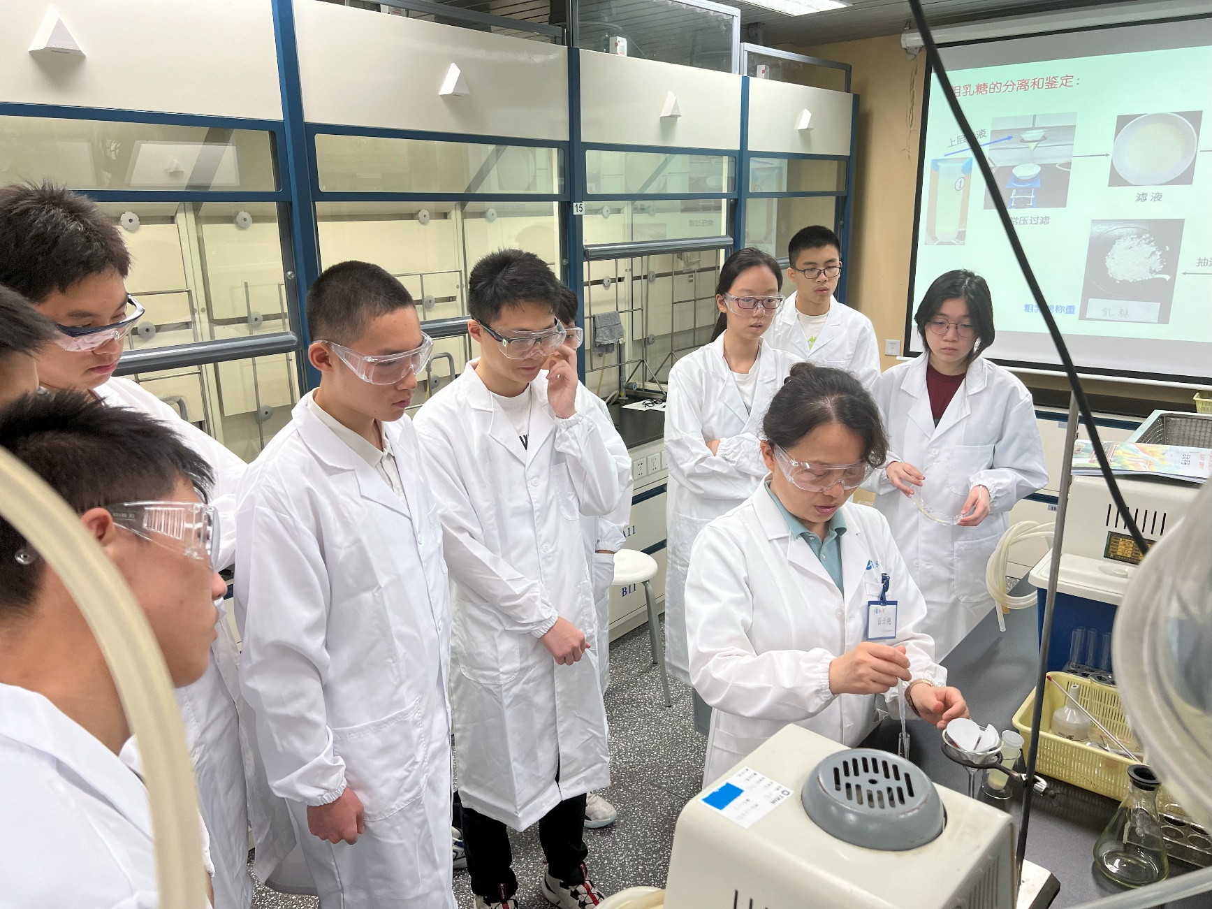 全天的有机化学实验中,匡云艳老师指导大家进行了牛奶试样中酪蛋白和乳糖的提取和鉴定实验。书本上介绍的蛋白质颜色反应,以及糖类的鉴定反应,在同学们的试管里一一呈现。