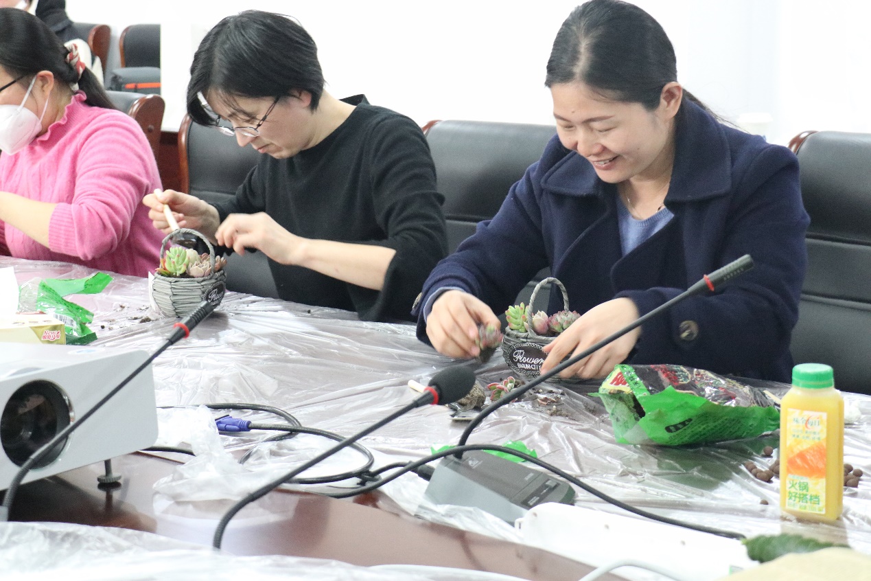 选择插花的教师们,在园艺师的指导下,手持剪刀,细致修剪着鲜嫩的花枝、调试高低、小心插入花泥,直至完成。而种植多肉的老师们,则小心地将花泥装入花盆,通过压、挪、定位,尽可能地调整到最佳造型,看似娇嫩的鲜花、多肉,在老师们的手中,很快变身成一个个春意盎然、独具匠心的花篮,或一盆盆生机勃勃、出挑俊秀的多肉组合。老师们一边欣赏着自己的作品,不时和自己邻座的同伴交流着,赞美着。热闹而简单的花艺摆弄和多肉种植,为繁忙的工作平添一丝休闲时光,祝所有的女性教师们节日快乐。