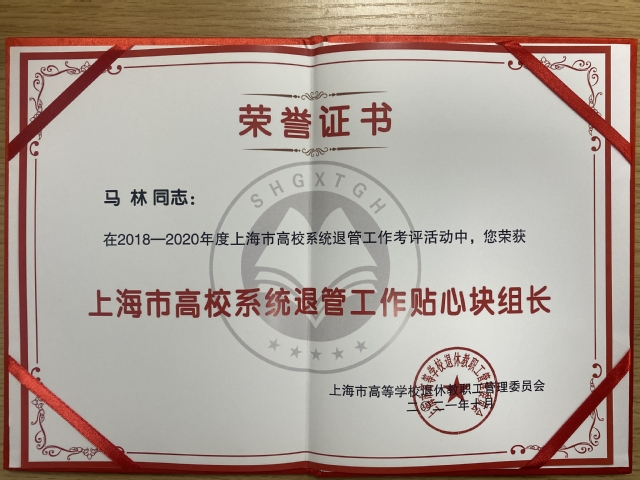 祝贺马林老师荣获“上海市高校系统退管工作贴心块组长”