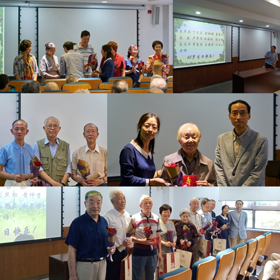 敬老节活动的重头戏“祝寿”在副系主任张丹维老师的主持下拉开序幕。随着温馨的生日快乐音乐旋律响起,大屏幕上跳跃出每一位寿星的名字,在场的寿星们在众人的欢呼雀跃中陆续上台,接受厂长资源 为寿星准备的生日礼物和鲜花。寿星们手捧鲜花、笑容满面的接受全场老师的节日祝福和生日祝福,而寿星们的发言则引起一阵阵掌声和共鸣,不时将活动推向一个又一个高潮。年轻一点的寿星感慨“我们生在新中国,长在红旗下,感谢祖国感谢党,更祝共和国70华诞生日快乐”;年纪稍长的寿星则回应“不像年轻的寿星那样幸运,我们出生时,祖国处于水深火热之中,活到80岁不易。但共同享受今天的好日子,向85岁进发~~~”;而年纪更长的寿星则深情回忆起1957年与身旁同伴们一起下乡劳动的情景,引起了现场多位老师的共鸣。简约而隆重的祝寿活动,伴随着各位寿星幽默风趣、真挚感人的肺腑之言,将在场的所有人带入进温馨、甜蜜的画面中:感恩、感谢、感激与祝福……