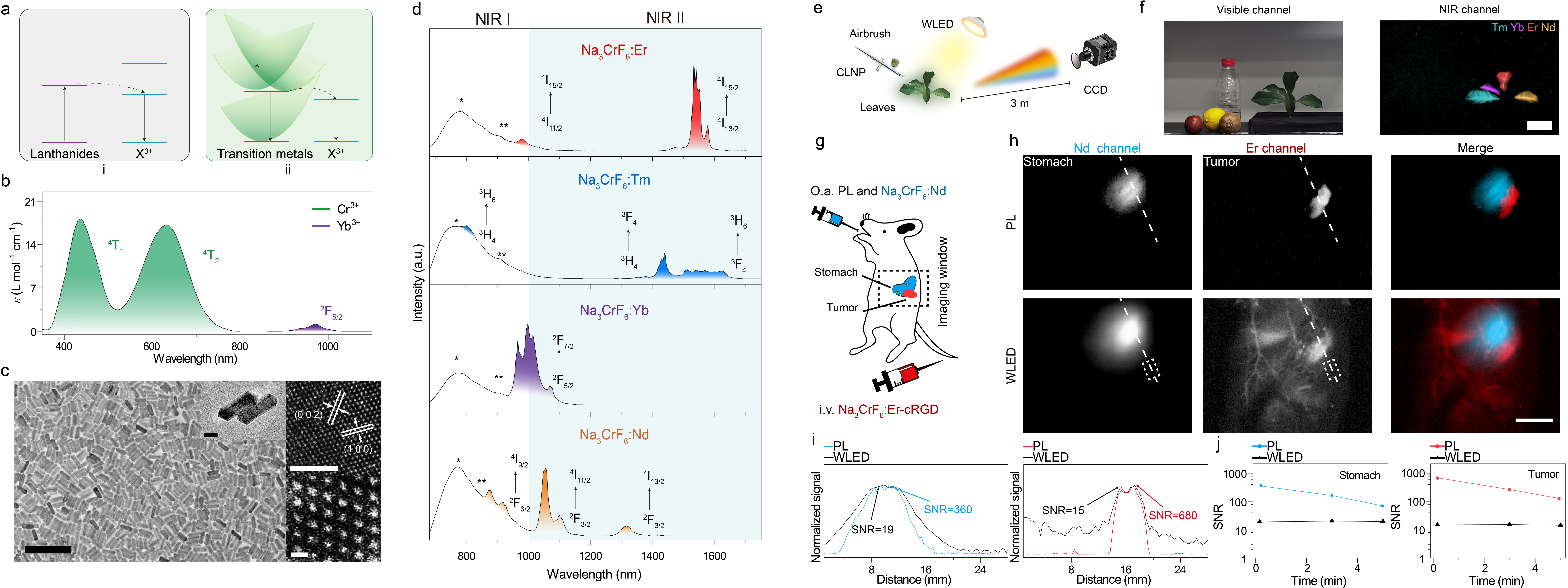 针对以上难题,张凡团队(//nanobiolab.cz-zy.net/)开发了一系列尺寸均一,结构和发射波长可调的新型过渡金属元素铬敏化的镧系纳米发光颗粒(Cr3+-sensitized lanthanide-doped nanoparticles, CLNPs)。三价铬离子作为人体必需的微量元素,同时具有较高的光吸收截面。其摩尔消光系数是常用的镧系敏化剂的十四倍,使其对激发光具有更强的收集能力。团队首次在纳米尺度实现了过渡金属离子对于六种镧系激活剂的敏化,发光范围覆盖900-1700 nm。此外,与需要激光激发的传统镧系敏化纳米粒子相比,新型的CLNPs在较弱的环境光照射下即可实现高效近红外发光。CLNPs的亮度比相同尺寸的传统镧系敏化纳米粒子最多高出三百七十倍。团队基于CLNPs良好的光学性质,实现了近红外窗口的四色加密和高信噪比的近红外第二窗口多重成像。这一技术的应用极大地简化了近红外成像的使用条件,同时也拓宽了近红外纳米探针的使用范围。