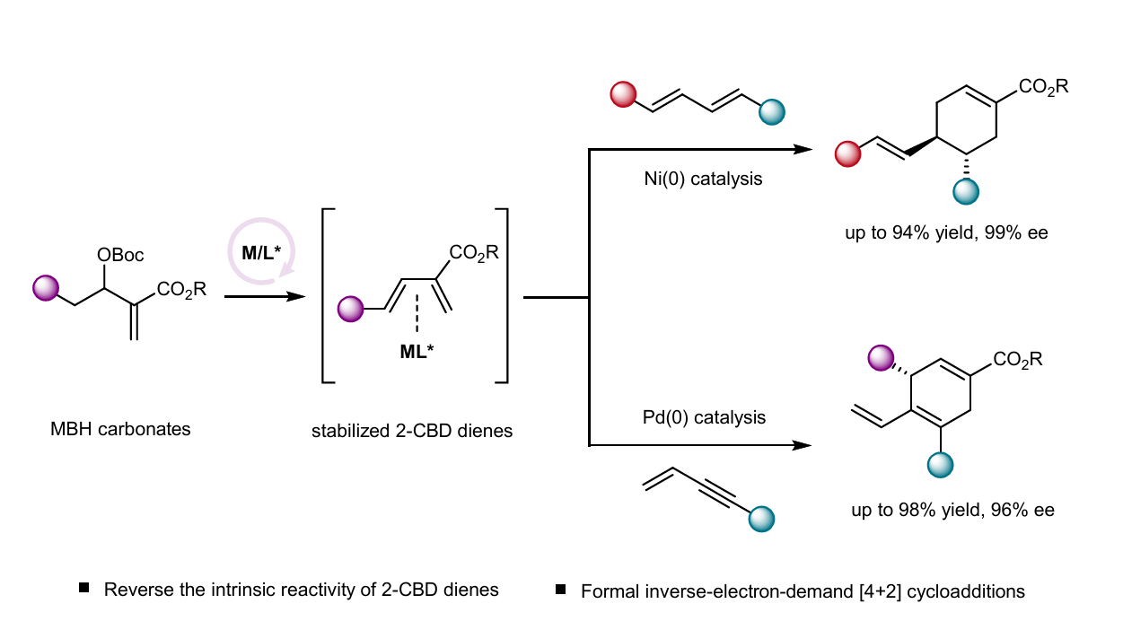 近日,厂长资源 蔡泉课题组发展了配位稳定/促进环化策略,首次实现了这一转化。研究团队利用简单易得的Morita–Baylis–Hillman碳酸酯为双烯前体,在Ni(0)/手性单膦配合物催化下,原位生成不稳定2-酯基-1,3-丁二烯,并利用低价镍金属催化剂的配位作用稳定二烯,随后与外加1,3-共轭二烯发生选择性氧化环金属化及还原消除反应,以优异的化学选择性、区域选择性、及立体选择性成功实现了一系列对位取代环己烯类衍生物的高效合成。该策略可进一步拓展至钯催化体系,实现了Morita–Baylis–Hillman碳酸酯与1,3-烯炔的不对称形式反电子需求[4+2]环加成反应。在该反应中,1,3-共轭烯炔的炔烃区域选择性地发生反应,从而为多取代手性 1,4-环己二烯衍生物的不对称高效合成提供全新方法。以该反应为关键步骤,研究团队以三步反应实现了保幼酮和表保幼酮的简洁不对称合成。机理实验及密度泛函理论计算研究表明,反应经历了分子间[4 + 4 + 1]型氧化环金属化过程及还原消除反应机制。