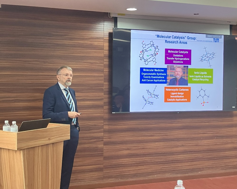 报告结束后,师生们纷纷加入讨论。Fritz E. Kühn教授对于大家提出的问题,不仅耐心地一一作答,还详细分享了自己在这一领域的研究心得。讨论环节中,师生们纷纷踊跃发言,现场气氛既热烈融洽,展现了浓厚的学术探讨氛围。