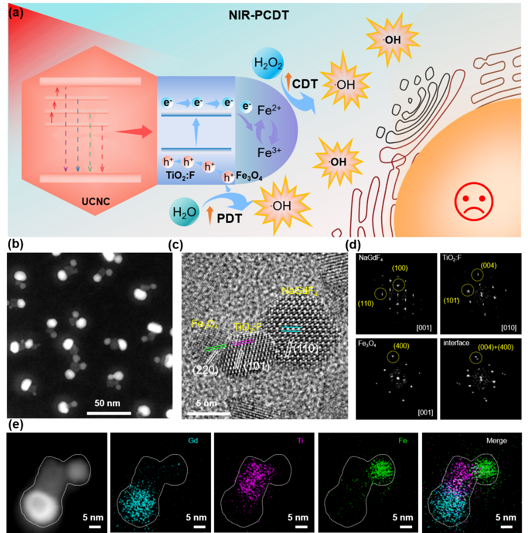 (a)UCNC-TiO2:F-Fe3O4异质结纳米晶用于促进近红外光驱动下的光动力和化学动力治疗。(b,c,e)UCNC-TiO2:F-Fe3O4异质结纳米晶扫描透射电子显微镜,高分辨透射电子显微镜和元素分布图。 (d)UCNC-TiO2:F-Fe3O4异质结纳米晶傅里叶变换图,分别对应(c)图中NaGdF4, TiO2:F,Fe3O4亚模块,以及TiO2:F-Fe3O4界面。
