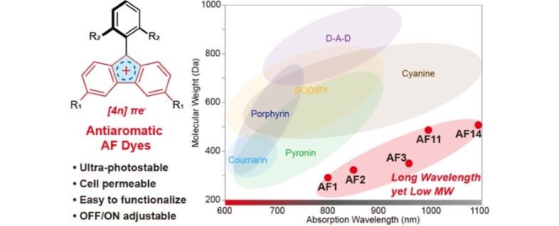 Long-wavelength, near-infrared small-molecule dyes are attractive in biophotonics. Conventionally, they rely on expanded aromatic structures for redshift, which comes at the cost of application performance such as photostability, cell permeability, and functionality. Here, we report a ground-state antiaromatic strategy and showcase the concise synthesis of 14 cationic aminofluorene dyes with mini structures (molecular weights: 299–504 Da) and distinct spectra covering 700–1600 nm. Aminofluorene dyes are cell-permeable and achieve rapid renal clearance via a simple 44 Da carboxylation. This accelerates optical diagnostics of renal injury by 50 min compared to existing macromolecular approaches. We develop a compact molecular sensing platform for in vivo intracellular sensing, and demonstrate the versatile applications of these dyes in multispectral fluorescence and optoacoustic imaging. We find that aromaticity reversal upon electronic excitation, as indicated by magnetic descriptors, not only reduces the energy bandgap but also induces strong vibronic coupling, resulting in ultrafast excited-state dynamics and unparalleled photostability. These results support the argument for ground-state antiaromaticity as a useful design rule of dye development, enabling performances essential for modern biophotonics.