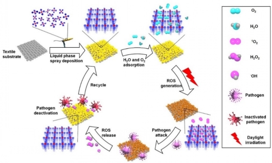 Wearable personal protective equipment that is decorated with photoactive self-cleaning materials capable of actively neutralizing biological pathogens is in high demand. Here, we developed a series of solution-processable, crystalline porous materials capable of addressing this challenge. Textiles coated with these materials exhibit a broad range of functionalities, including spontaneous reactive oxygen species (ROS) generation upon absorption of daylight, and long-term ROS storage in dark conditions. The ROS generation and storage abilities of these materials can be further improved through chemical engineering of the precursors without altering the three-dimensional assembled superstructures. In comparison with traditional TiO2 or C3N4 self-cleaning materials, the fluorinated molecular coating material HOF-101-F shows a 10- to 60-fold enhancement of ROS generation and 10- to 20-fold greater ROS storage ability. Our results pave the way for further developing self-cleaning textile coatings for the rapid deactivation of highly infectious pathogenic bacteria under both daylight and light-free conditions.