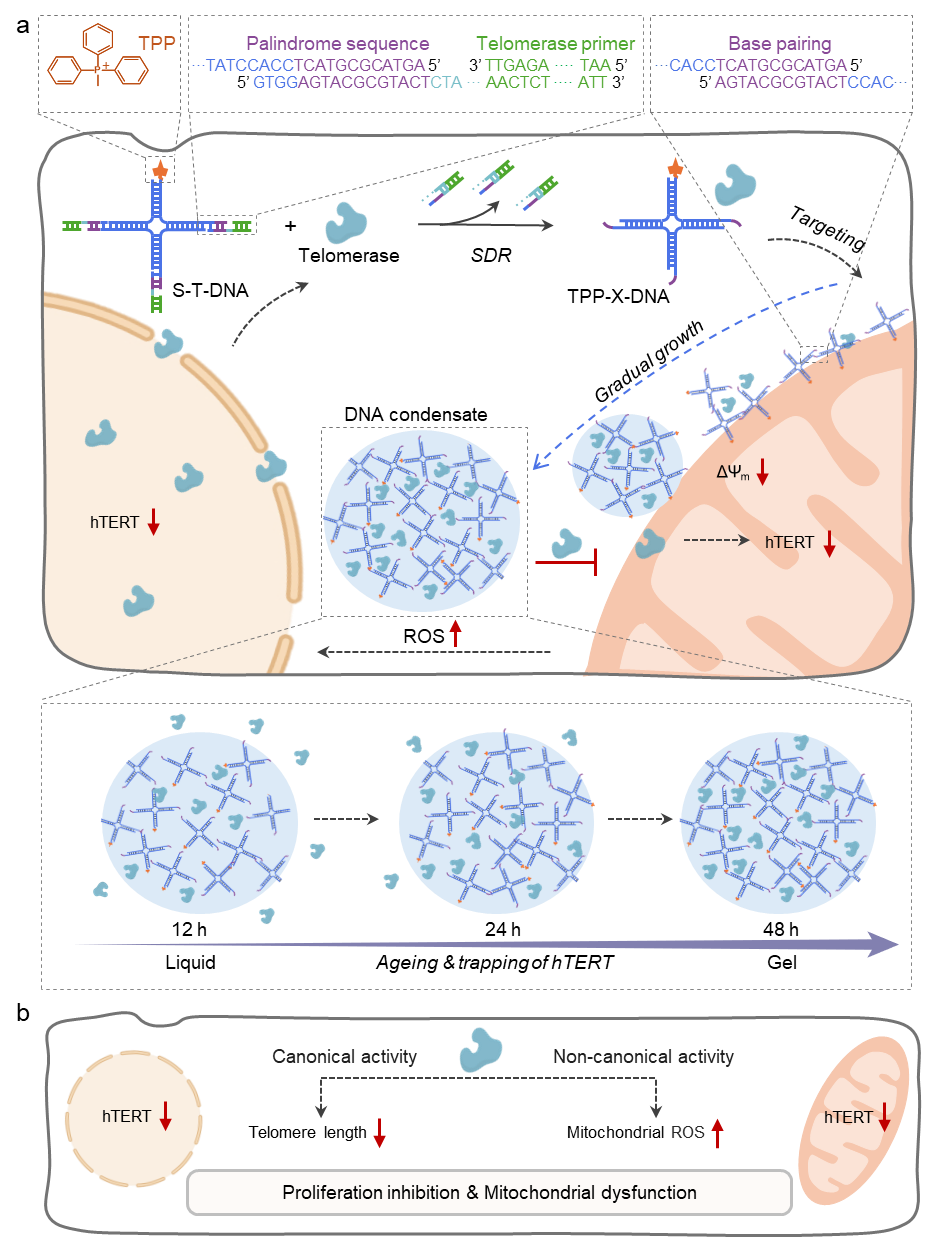 受天然细胞区室化调控机制的启发,研究团队构建了一种基于枝状DNA(S-T-DNA)的动态自组装系统。该系统通过模块化设计整合了线粒体靶向单元三苯基膦(TPP)、端粒酶识别引物以及自组装回文序列,实现了在肿瘤细胞内的特异性激活与程序化组装。进入肿瘤细胞后,其端粒酶识别模块可特异性响应肿瘤标志物hTERT蛋白,触发链置换反应释放功能基元,进而在胞质中动态组装为靶向线粒体的DNA凝聚体。该过程可通过荧光共振能量转移实现实时原位监测,从而在活细胞内实现对人工纳米结构组装与演变的可视化追踪。形成的DNA凝聚体不仅作为功能执行单元,也构成一个集成的生物传感界面:通过扰动线粒体膜电位并诱导活性氧水平升高,直观反馈对细胞器的影响;升高的活性氧进一步作为信号,驱动hTERT蛋白从核内向胞质转位。借助荧光共定位与蛋白质定量分析,揭示了hTERT被捕获并滞留于DNA凝聚体的过程,实现了对目标蛋白迁移行为的动态示踪。研究结果表明,该系统可有效抑制hTERT功能,导致肿瘤细胞端粒缩短、线粒体DNA损伤及增殖显著受阻。