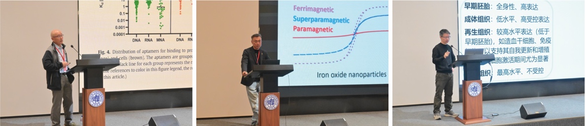 最后一个专题由华东师范大学李迪教授、南京邮电大学晁洁教授、湖南大学宋国胜教授、南京大学应佚伦教授分别作了“结合水调控蛋白质结构与功能”、“核酸分子机器与生物医学应用”、“长余辉与超声发光分子成像探针及活体动态诊疗应用”和“单分子化学反应过程的纳米孔道电化学测量”的学术报告。各专题后设研讨环节,学术交流氛围热烈。