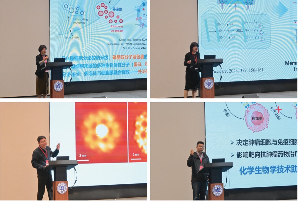 第二个专题由来自厦门大学颜晓梅教授、中国科学院化学研究所于萍研究员和中国科学院上海有机化学研究所李霄鹏研究员、中国科学院上海药物研究所周虎研究员分别作了题为“从单颗粒表征到临床关联:纳米流式技术解密细胞外囊泡在诊断与细胞耐药中的功能密码”、“Confined Ion Transport: From Iontronic Sensing to Neuromorphic Computing”、“离子软着陆-STM-同步辐射一体化成像与谱学”和“基于质谱的药物蛋白质组学研究”的学术报告。