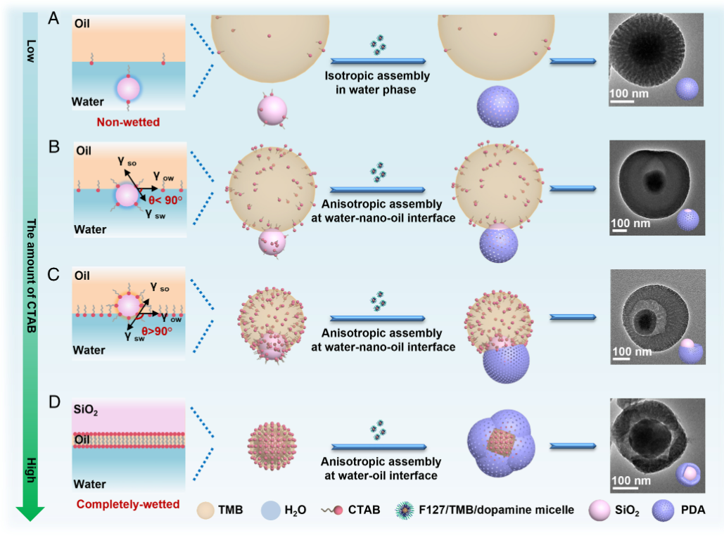 乳液界面工程通过调节水/油微乳液界面,成为合成各向异性纳米材料的重要策略。但液-液界面处的组装通常受到不稳定界面和有限可调节性的限制,导致形态受限,因此构建具有不同组分的多功能纳米复合物仍面临巨大挑战。当纳米颗粒引入微乳液体系时,它们通常定位在水/油界面,表面活性剂的存在影响着纳米颗粒在界面上的浸润行为,进而影响材料的组装行为。因此,通过调控纳米颗粒在界面处的浸润状态,为各向异性多功能纳米复合材料的构筑提供了诸多潜在可能。